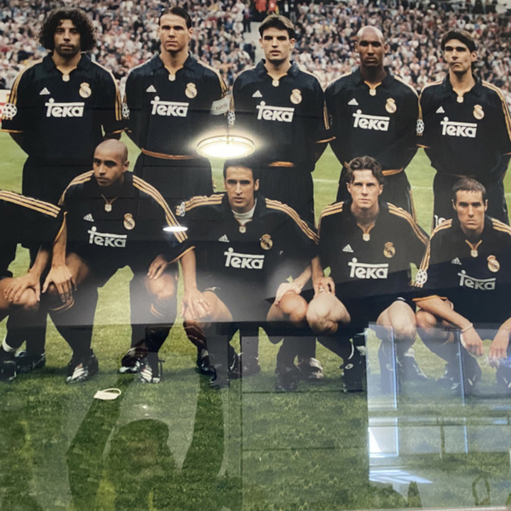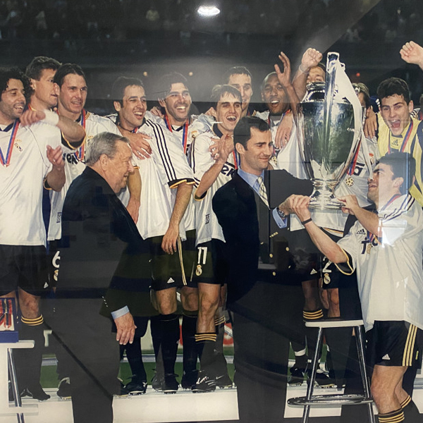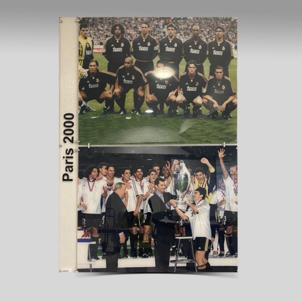 Capturando momentos icónicos, este conjunto de dos fotografías de la UEFA Champions League del año 2000 muestra al equipo de fútbol del Real Madrid alineado (foto superior) y celebrando (foto inferior) con el actual Rey Don Felipe VI. Durante este memorable partido final el 24 de mayo del 2000, el Real Madrid venció al Valencia Club de Fútbol 3-0, logrando así su octava Copa de Europa. Este conjunto de fotografías se titula "París 2000" y se presenta en su marco original de Perspex, que muestra signos de deterioro. Esta es una oportunidad única para poseer una pieza de la historia y el patrimonio artístico del Real Madrid Club de Fútbol. Este artículo fue adquirido del Departamento de Patrimonio del Real Madrid Club de Fútbol y ha sido expuesto en varias áreas de las oficinas del Real Madrid a lo largo de los años. El producto incluye un Certificado de Autenticidad de Memorabilia Oficial del Estadio Santiago Bernabéu. Por favor, tenga en cuenta que el artículo ha sido adquirido directamente del Estadio Santiago Bernabéu y se venderá en su estado original, con imperfecciones naturales. Tamaño (aprox.) 1.10 m x 1.61 m (43.31 x 63.39 pulgadas).